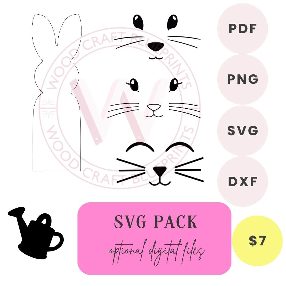 In the SVG pack: 2 bunny faces in 4 file formats: SVG, DXF, PNG, PDF.